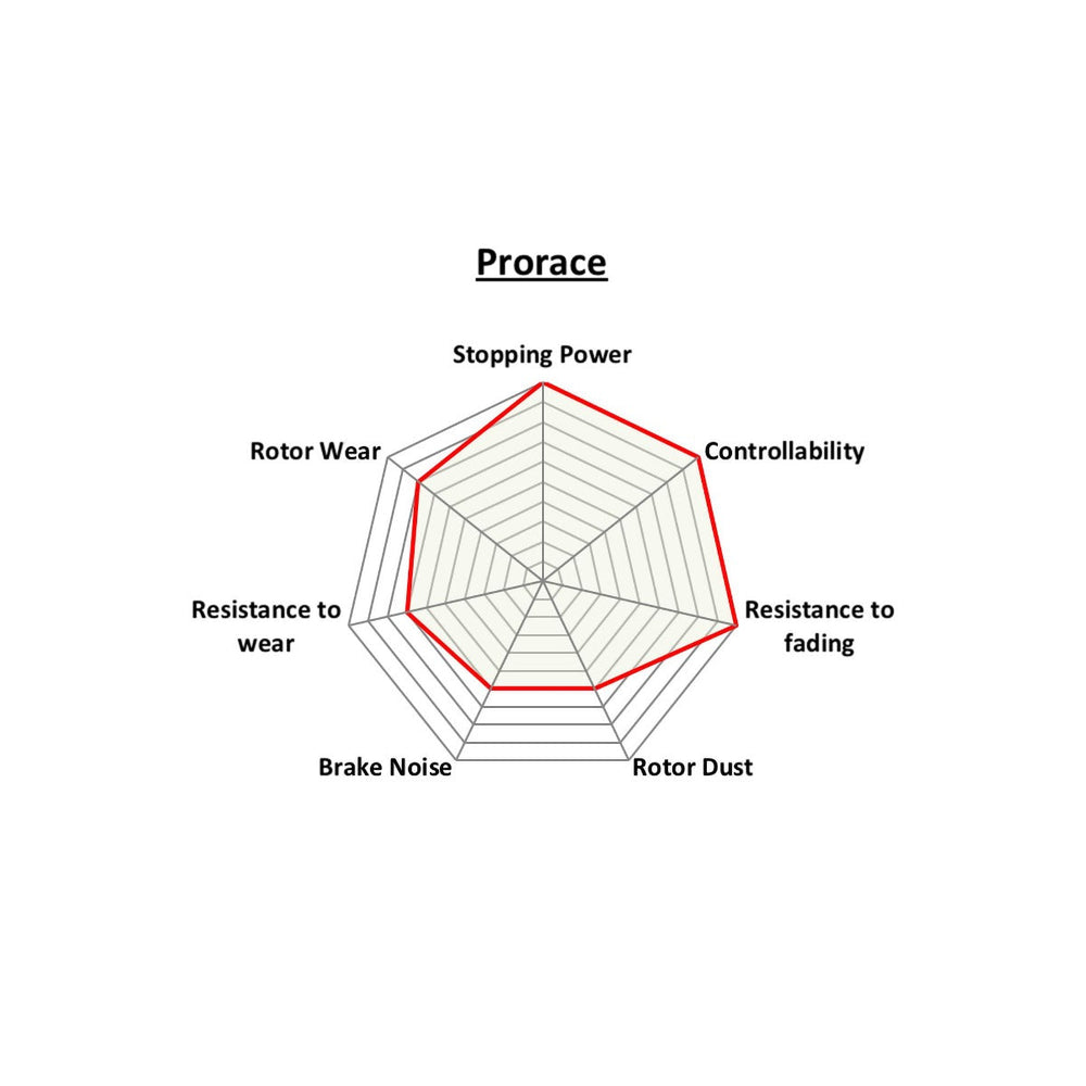 The Prorace brake pad material is 0.36 to 0.58mu, which provides incredible stopping power.
