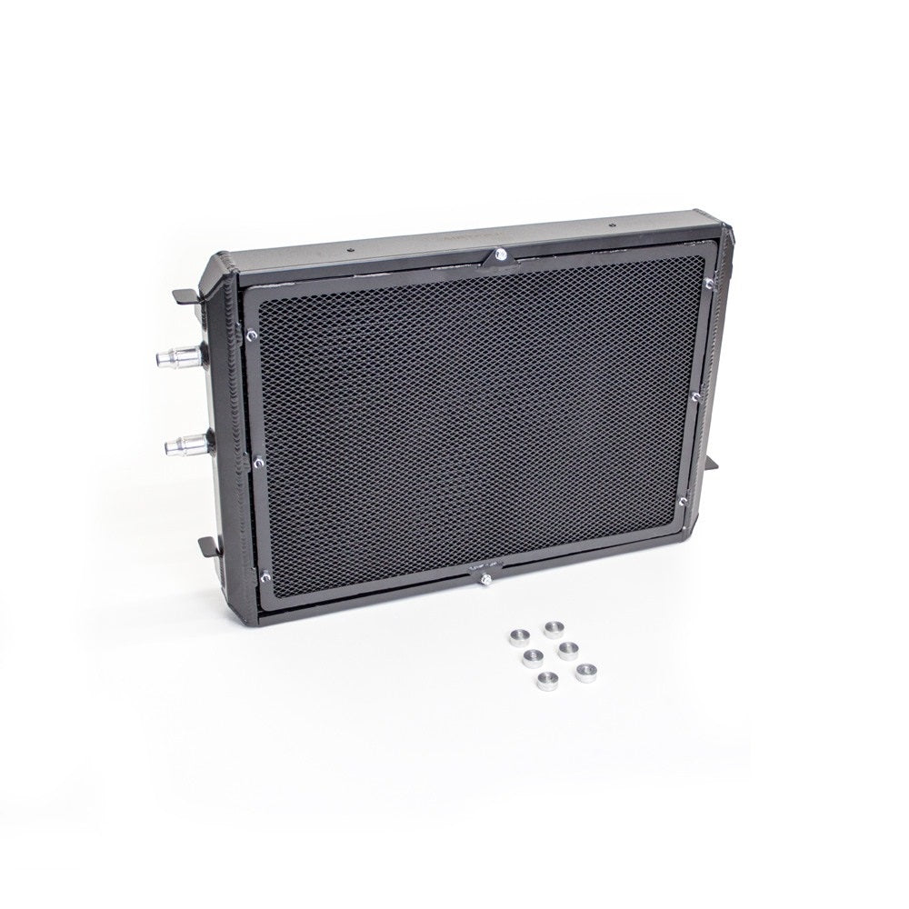 Despite the huge increases that will allow the charge cooler system to run cooler for longer, the radiator fits neatly behind the bumper and requires no modifications to fit, using the OEM mounts and the original coolant connectors. To protect the larger core in its vulnerable position at the front of the car, there is also a (removable) stone guard.