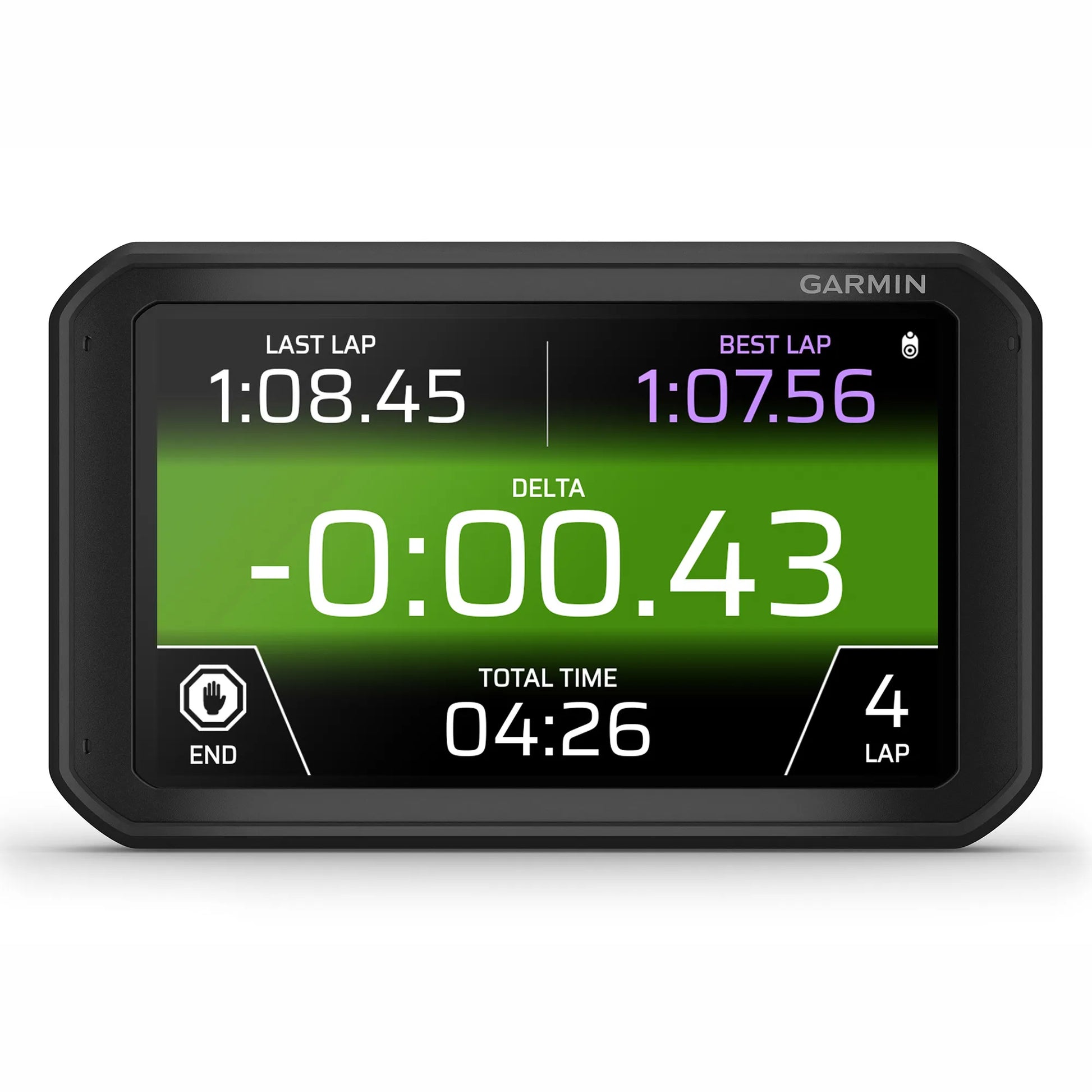 On the course, Garmin Catalyst driving performance optimiser keeps track of your best lap time, adaptive delta time, number of laps and total session time.