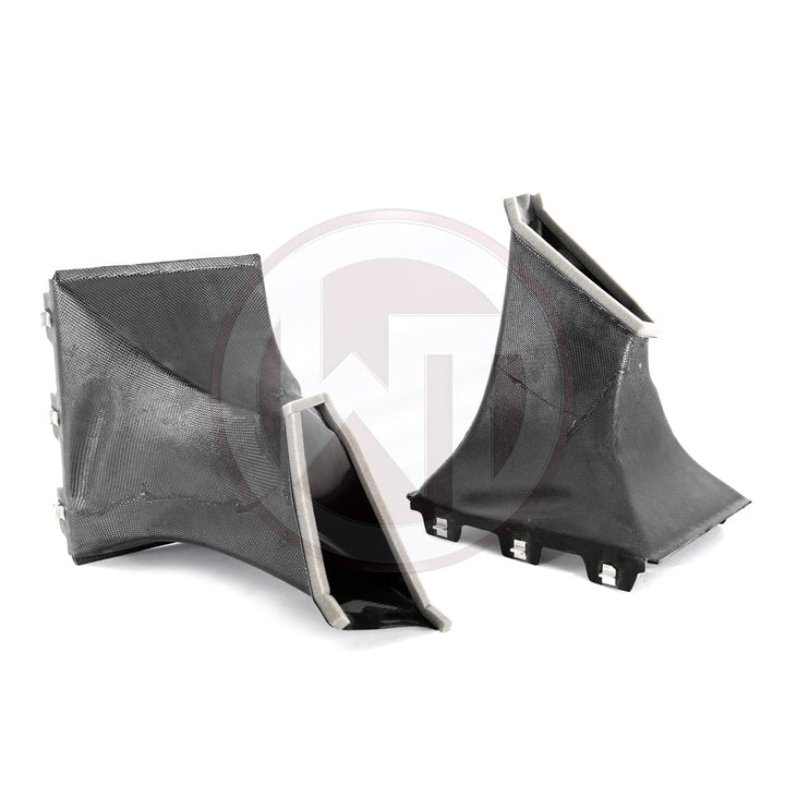 The Wagner Tuning Porsche 991 911 Turbo (S) Intercooler Kit has the following core size (2 x [320mm x 238mm x 110mm] = 16,755L)/(2x[12,6Inch x 9,37Inch x 4,33Inch = 1022,45Inch³), providing 40% more volume compared to the stock mounted intercooler. Our engineers have increased the intercooler core size and efficiency, as well as improved the end tank design to remove any OEM bottlenecks, resulting in increased flow rating and charge cooling properties. This intercooler Kit uses our award winning Wagner Tuning Competition Intercooler Core which is made specifically for this application. It is one of the highest quality Tube Fin cores available on the market. The intercooler has just a weight of 2x 5,3kg. Flow analysis and simulations were created to optimise the design for best possible Internal Airflow. The Intercooler Kit also includes a suitable carbon air shroud to ensure optimum airflow to the intercooler. As well as additional silicone hoses with an enlarged cross-section. This intercooler kit is the best choice when it comes to performance gains and low intake temperatures. Anti Corrosion protective Coating with perfect thermal heat dissipating character. Optimal cooling with clearly more power. Kit is ready for installation. Fitment is easy, replacing the OEM intercooler. All of our products undergo rigorous quality control and are also tested by compressive strength of up to 6 bar. This intercooler kit is suitable for racing. Ø65mm (2,56Inch) In and Outlets.